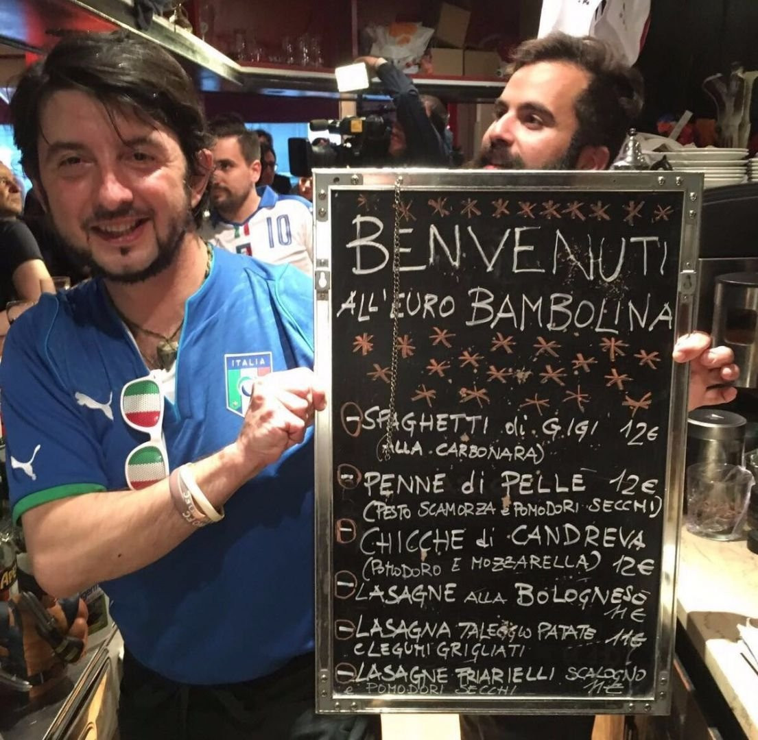 Una cena a lume di Azzurro. Entri nel locale, dai una sbirciata al menù della lavagnetta e ti senti subito a casa: spaghetti di Gigi (alla carbonara), penne di Pellè (pesto, scamorza e pomodori secchi), chicche di Candreva (pomodoro e mozzarella). Siamo in Francia, precisamente al Bambolina Caffè, un locale di Parigi. Curiosità? È sede del Paris San Gennar, club del Napoli a Parigi. Guarda caso, il proprietario è un italiano, Andrea Conti, tifoso del Torino che commenta così il menù azzurro: “Diciamo che rivedendo il menù e ripensando alla partita col Belgio ho azzeccato l’assist, il gol e il portierone. Mancherebbe Giaccherini? Vero anche se lo vorrei anche al Toro”. E poi la sua passione col calcio si intreccia con la musica… Bambolina Caffè? Perché una delle sue canzoni preferite è “Bambolina Barracuda” di Luciano Ligabue.