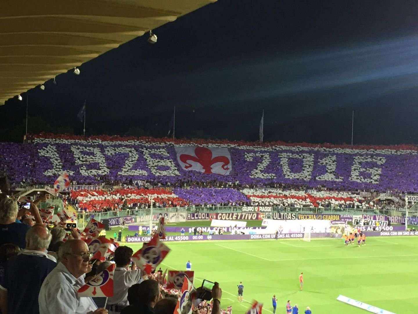 Tanti auguri, Fiorentina. 90 candeline, tonde tonde. Da spegnere insieme ai protagonisti della tua storia. Una festa in toni sommessi sì, per rispetto delle vittime del sisma che ha colpito il centro Italia. Ma che comunque la società voleva celebrare in onore dei suoi campioni riuniti per una volta tutti al Franchi, di nuovo. La vittoria contro il Chievo fa da contorno, la coreografia speciale della Curva Fiesole a inizio partita è soltanto l’antipasto. Ad illuminare c’è la torre di Maratona, per una sera tinta di vola.