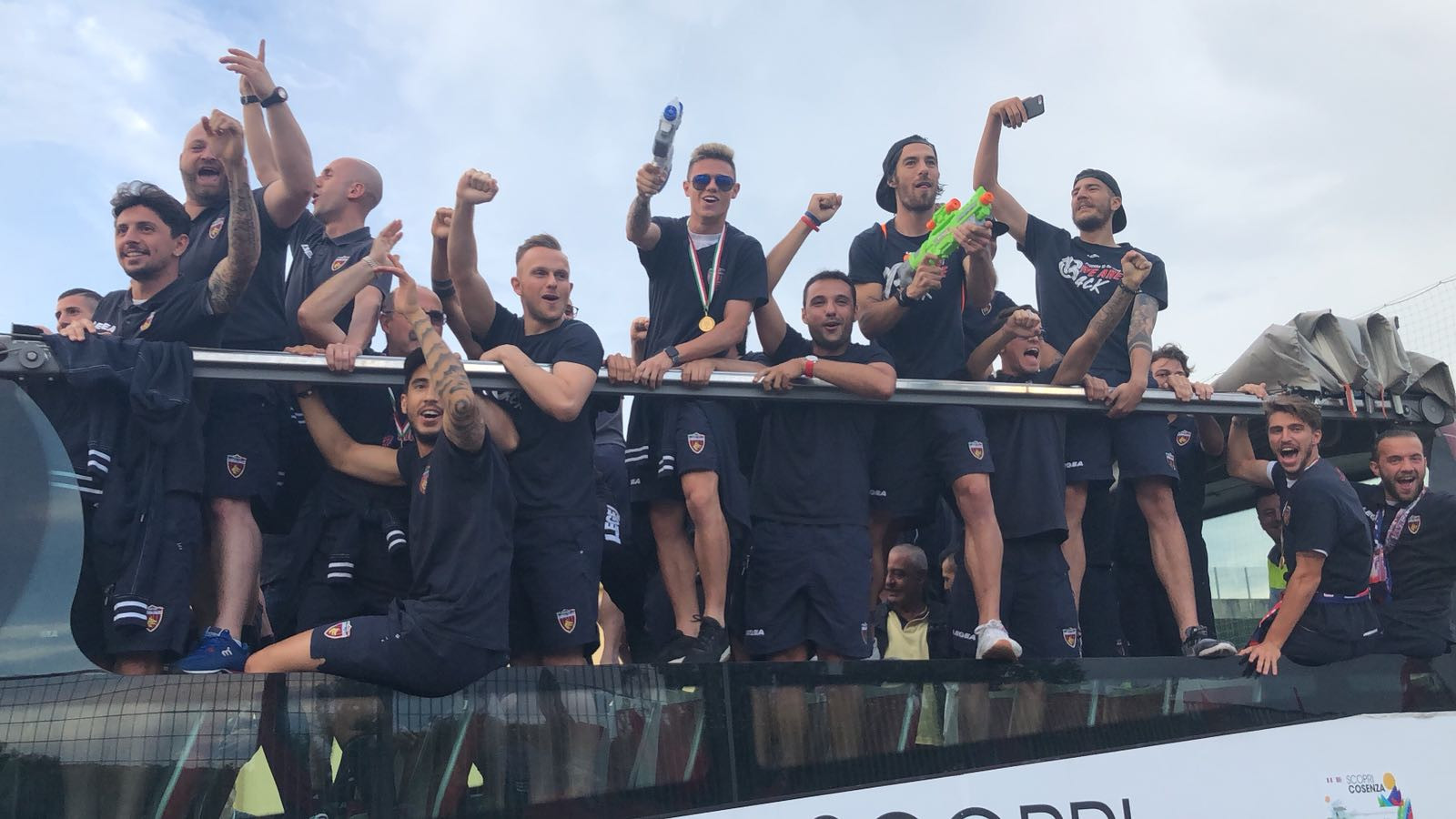 E dopo la festa di ieri notte, Cosenza continua l’abbraccio ai suoi eroi. La squadra è tornata da poco da Pescara, giusto il tempo di salire sul pullman scoperto per recarsi dallo stadio al centro. Partenza dal San Vitino dunque. Poi Via degli Stadi, Via Panebianco, Via Popilia, Piazza Europa, Piazza Loreto, Piazza Bilotti, Piazza dei Bruzi, Piazza Valdesi, C.So Telesio, Portapiana, Murales Marulla: insomma, un itinerario che comprende tutti i quartieri.