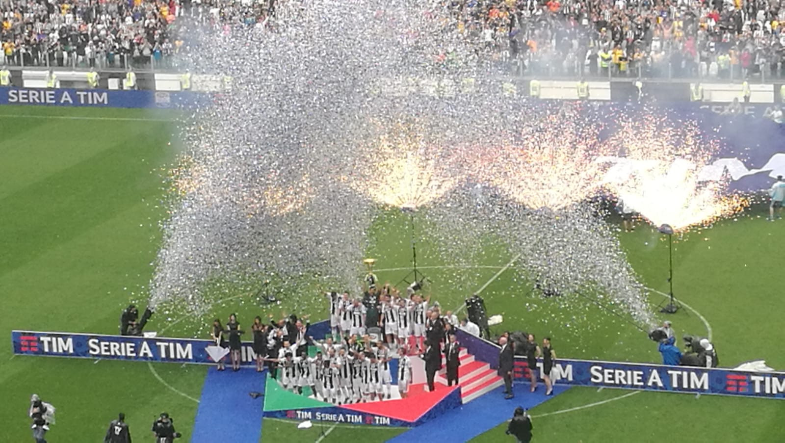 Il settimo campionato consecutivo, l’addio di Buffon e quello di Lichtsteiner. Tutto in 90 minuti. La Juventus saluta per l’ultima volta da giocatore il suo capitano e festeggia un’impresa mai riuscita in Italia. Al fischio finale è festa grande, con la passerella d’onore che accoglie sotto la pioggia tutti i giocatori bianconeri sul podio. L’ultimo a salire, ovviamente, Buffon, al suo ultimo trofeo da giocatore. Ecco le immagini della premiazione.