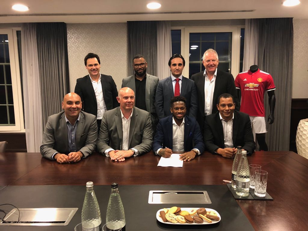 Per il giocatore, 5 anni di contratto a 5,5 milioni a stagione. In alto, ecco Fred al momento della firma insieme agli agenti e agli intermediari Basesoccer dell’operazione.
