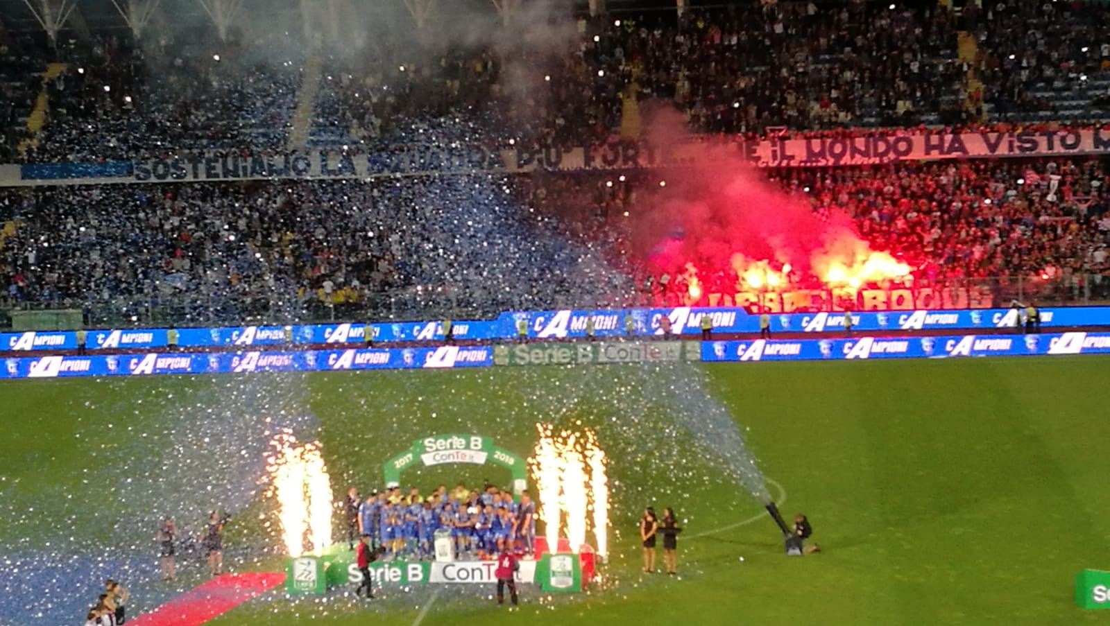 Mille emozioni nonostante un campionato dominato, un urlo liberatorio al termine di 90 minuti apparentemente insignificanti. I fuochi d’artificio ad illuminare il cielo del Castellani, dove continua la festa dell’Empoli dei record. Con il Perugia arriva un’altra vittoria, il ventottesimo risultato utile consecutivo. Mai nessuno così bene nella storia della B. Una promozione conquistata quasi un mese fa contro il Novara, sempre davanti ai propri tifosi. Pasqual e Donnarumma a rimontare la rete iniziale di Di Carmine. “Ce ne andiamo in Serie A” Cantano i tifosi azzurri, che abbandoneranno il Castellani solo per seguire il pullman scoperto su cui la squadra girerà per la città. Dopo aver visto i ragazzi di Andreazzoli alzare al cielo la Coppa della Serie B, ovviamente. Primo posto incontrastato, lontano da tutti. 85 punti, tredici in più di un Parma che comunque fa festa. 88 gol fatti, solo due in meno del Pescara targato Zeman, Immobile e Insigne. Sono solo alcuni dei numeri dell’Empoli degli imbattibili. Mai una sconfitta con Andreazzoli in panchina, lui che aveva raccolto i primi tre punti proprio un girone fa al Curi, lui che viene acclamato da tutto lo stadio. Così come il Presidente Fabrizio Corsi, il primo ad essere premiato. Ci sono le sue mani su questo gioiello, le sue idee, il suo coraggio. La prossima sarà l’undicesima Serie A della sua Presidenza, un miracolo per un comune di 50 000 abitanti. Poi ecco Andreazzoli, il condottiero, colui che ha trasformato in oro l’eredità lasciata da Vivarini, colui che ha frantumato anche i record di Sarri. A seguire Caputo e Donnarumma, 48 gol in due. Il talento di Bennacer, le facce giovani di Luperto, Krunic e Zajc. E per ultimo lui, Manuel Pasqual. Il Capitano, uno dei pochi reduci dall’incubo del Barbera dello scorso anno. Uno che ha giocato in Champions e che è sceso in B: “Riportare l’Empoli nella serie che merita la mia ultima battaglia” Aveva detto. Ci è riuscito, con il solito numero 23 sulle spalle. Ora la A, di nuovo. Per un gruppo che non vuole più fermarsi.