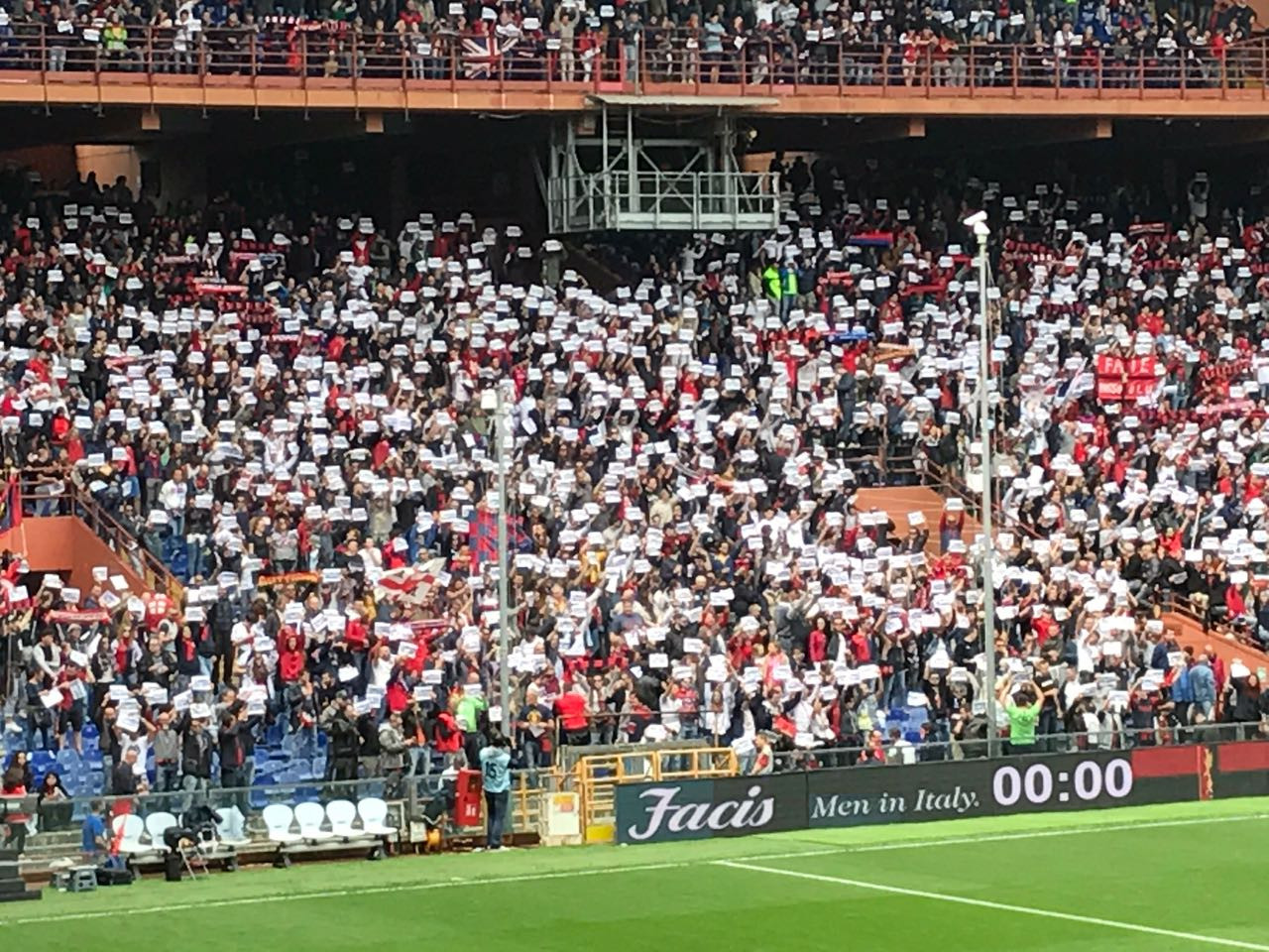 Striscioni capovolti nei distinti e in Sud, diecimila fogli bianchi con la scritta ‘Vattene’ in Gradinata Nord: eccola la protesta dei tifosi del Genoa che continua, destinatario il presidente Preziosi oggi assente dal Ferraris. Dopo la manifestazione di due settimane fa contro l’Atalanta (striscione contro Preziosi nella Gradinata Nord, striscioni capovolti nel resto dello stadio, cori contro il presidente e Nord girata di spalle dopo l’ennesimo gol) la protesta rossoblù é continuata così: ennesima richiesta al numero del Grifone di lasciare la guida del club e cori alla squadra all’entrata in campo di Genoa e Lazio. Ecco la gallery della protesta dei tifosi: