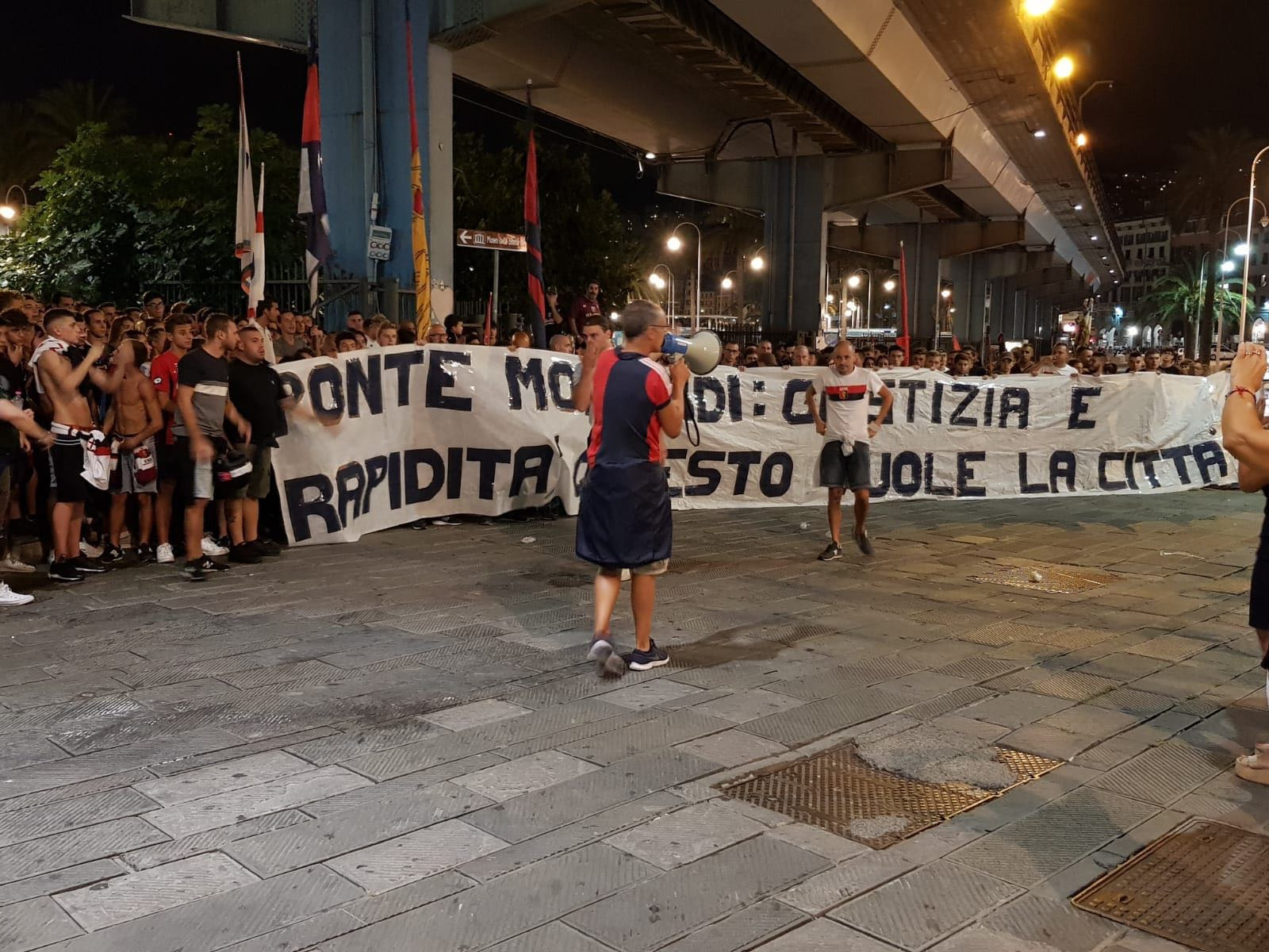 Tutti in corteo, partito dal Museo del club e diretto verso il centro della città, senza bandiere e fumogeni, ma con un solo striscione a fare da guida: “Ponte Morandi: giustizia e rapidità, questo vuole la città” il messaggio in nero su bianco a chiedere giustizia per le vittime.