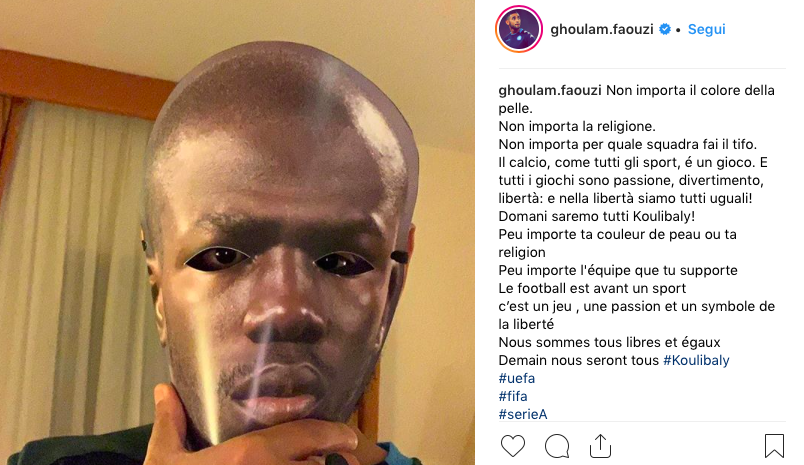 E al San Paolo di Napoli, in maniera particolare, domani andrà esattamente così. La sfida della squadra di Ancelotti contro il Bologna, infatti, è stata colta come occasione utile da Faouzi Ghoulam per invitare tutti i tifosi presenti allo stadio a portare un foglio con il volto di Koulibaly stampato o, allo stesso tempo, indossare una maschera (stampata a casa) con il volto del difensore senegalese, dando man forte ad un’iniziativa già promossa da un gruppo di supporter azzurri attraverso una pagina Facebook.
