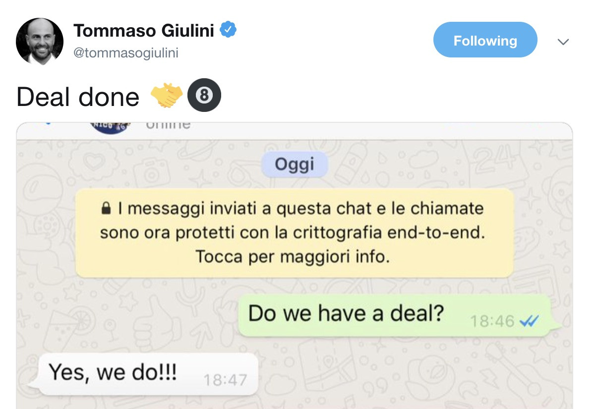 Il calciomercato al tempo dei Social. E di WhatsApp. I protagonisti sono due: Tommaso Giulini e Luca Cigarini. Rispettivamente, presidente e centrocampista del Cagliari. Nella giornata di ieri, i sardi avevano trovato l'accordo per il rinnovo contrattuale del giocatore (oltre a lui, anche Ceppitelli) fino al 2020. Ieri l'indiscrezione, oggi la conferma. Che Giulini dà tramite i social, con uno screenshot della sua chat aperta con il giocatore: "Abbiamo un accordo?" "Sì". "Ti aspetto domani per la firma!". Accordo trovato e reso noto al pubblico social. Che sta diventando sempre più interattivo.