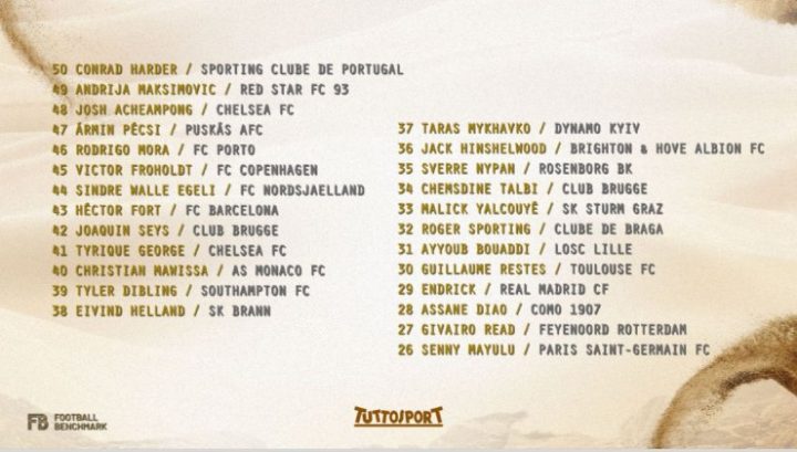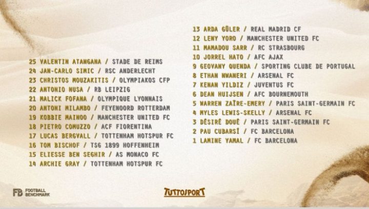 1º Lamine Yamal (Barcellona); 2º Pau Cubarsi (Barcellona); 3º Desirè Douè (PSG); 4º Lewis-Kelly (Arsenal); 5º Zaire-Emery (PSG); 6º Huijsen (Bornemouth); 7º Yildiz (Juventus); 8º Nwaneri (Arsenal); 9º Quenda (Sporting CP); 10º Hato (Ajax).