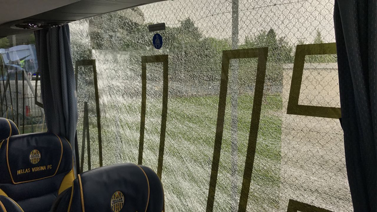 Attimi di apprensione per l’Hellas Verona, a pochi minuti dalla partita contro il Vicenza: il pullman della squadra infatti, procedendo scortato dalla polizia verso il Bentegodi, è stato preso a sassate dai tifosi del Vicenza mentre passava davanti al parcheggio del settore ospiti. Per fortuna nessuna conseguenza grave e nessun ferito, solo il vetro di un finestrino crepato e paura per chi era seduto lì vicino.