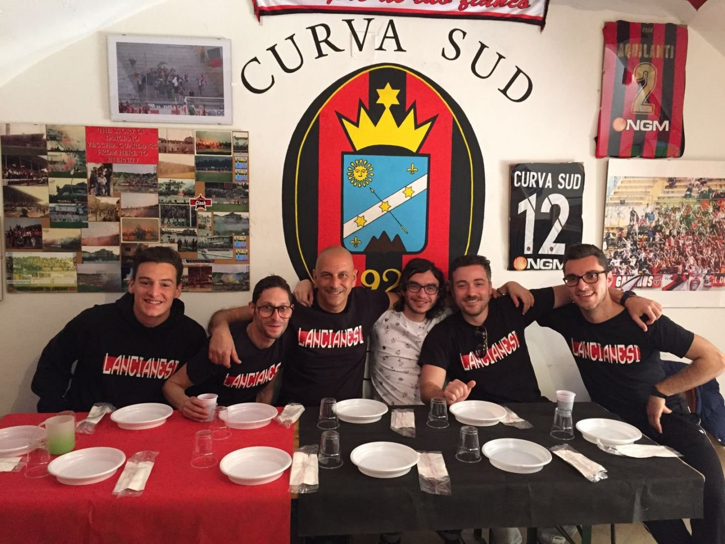 La tavola – anzi le tavole, perché sono almeno 4 – sono già imbandite: piatti e bicchieri di carta, tovaglie rosse ed una brocca di Montepulciano a fare da centrotavola. Tutto attorno sciarpe del Lanciano(ovviamente), ma non solo. “Conserviamo tutte quelle delle tifoserie che negli anni ci hanno dimostrato affetto”. Le voci di sottofondo sono tante, perché ognuno qui ha una storia da raccontare, ma tra la folla si fa posto il più piccolo di tutti. Danilo Di Liberto, ma se lo chiami così potrebbe non voltarsi neppure per rispondere. Per tutti lui è Marzianetto “Ma non lo vedi che sembra E.T.?”, spiegano in coro i ragazzi del Club Lancianesi.