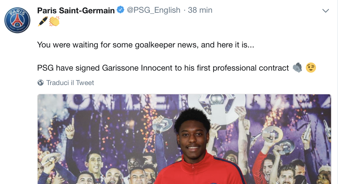 “State aspettando una notizia di un portiere…”. Così scrive il Paris Saint Germain su Twitter, e tutti si allarmano. Finalmente l’annuncio di Buffon? Non proprio. Perché il portiere in questione è il giovane Garissone Innocent, che ha firmato il suo primo contratto da professionista. E il Psg ha illuso tutti con questo annuncio, che però a sua volta contiene una piccola rivelazione. Perché implicitamente il Psg ha confermato l’attesa sull’arrivo di Gigi Buffon, annuncio che arriverà comunque nei prossimi giorni.