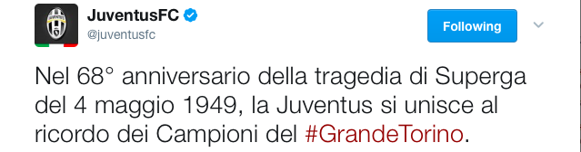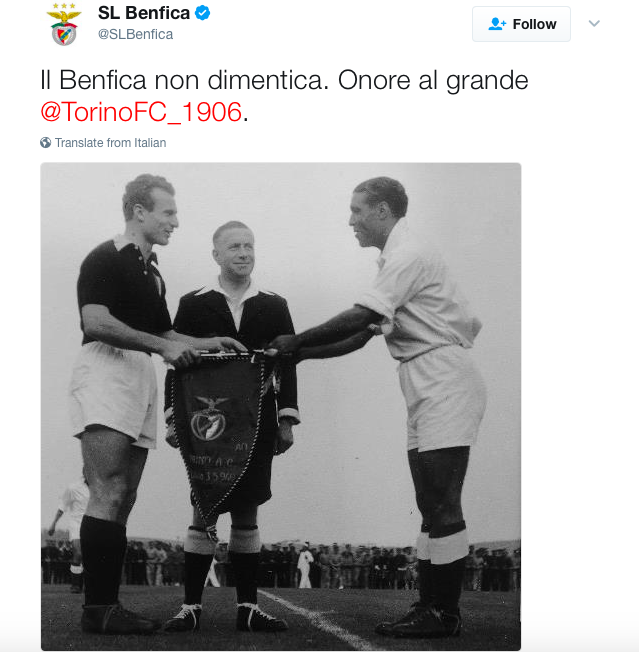 “Il Benfica non dimentica. Onore al Grande Torino”, così la squadra lusitana ricorda quella drammatica giornata, con i granata di ritorno proprio da Lisbona, dopo aver giocato una partita di beneficenza. Dall’altra parte della Mole anche la Juventus si stringe intorno al Torino: “Nel 68° anniversario della tragedia di Superga del 4 maggio 1949, la Juventus si unisce al ricordo dei Campioni del #GrandeTorino