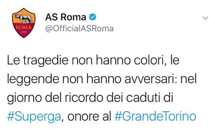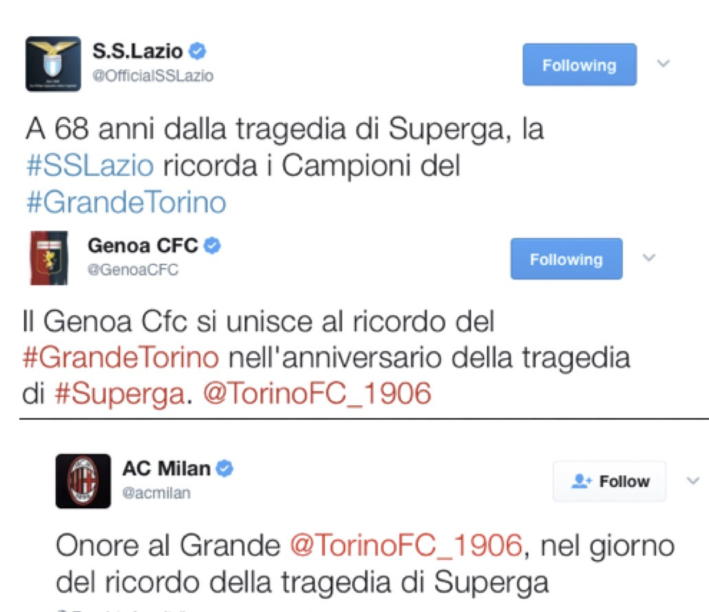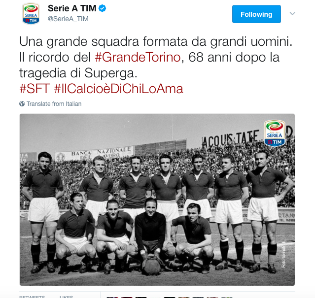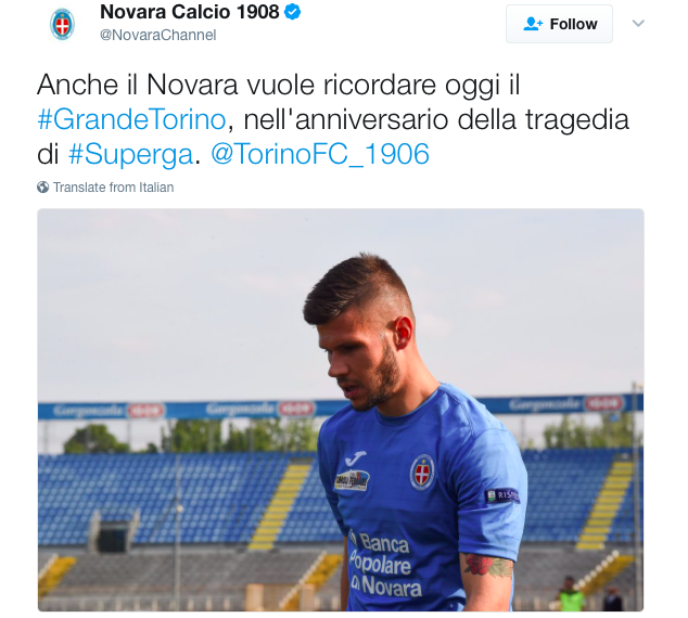 Anche l’altra piemontese, il Novara si unisce al cordoglio del ricordo del grande Torino. E poi la Serie A che dal proprio account ufficiale: “Una squadra formata da grandi uomini. Il ricordo del #GrandeTorino, 68 anni dopo la tragedia di Superga”