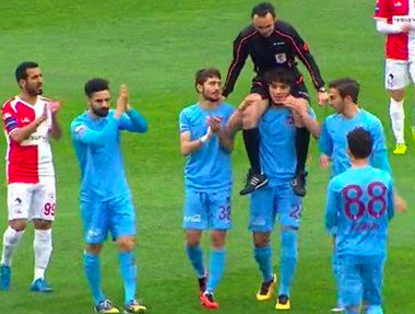 Un episodio tanto particolare quanto poco apprezzato dalla terna, il cui video ha fatto il giro del mondo, spingendo il calciatore a trovare il modo migliore per porgere le sue scuse al malcapitato Bitnel. E l’occasione giusta è arrivata proprio con la designazione dell’arbitro per l’amichevole tra Trabzonspor-Samsunspor: al quinto minuto di gioco, Dursun ha preso improvvisamente sulle spalle l’arbitro, portandolo insieme ai compagni di squadra verso la terna, nel frattempo riunitasi a metà campo. Durante il tragitto, strette di mano e sorrisi con i calciatori, con il pubblico pronto ad applaudire divertito l’accaduto. Giunti al termine dell’insolita passeggiata, l’abbraccio tra Dursun e Bitnel, con il quarto uomo che suggella il tutto utilizzando la bomboletta spray come fosse un fumogeno.