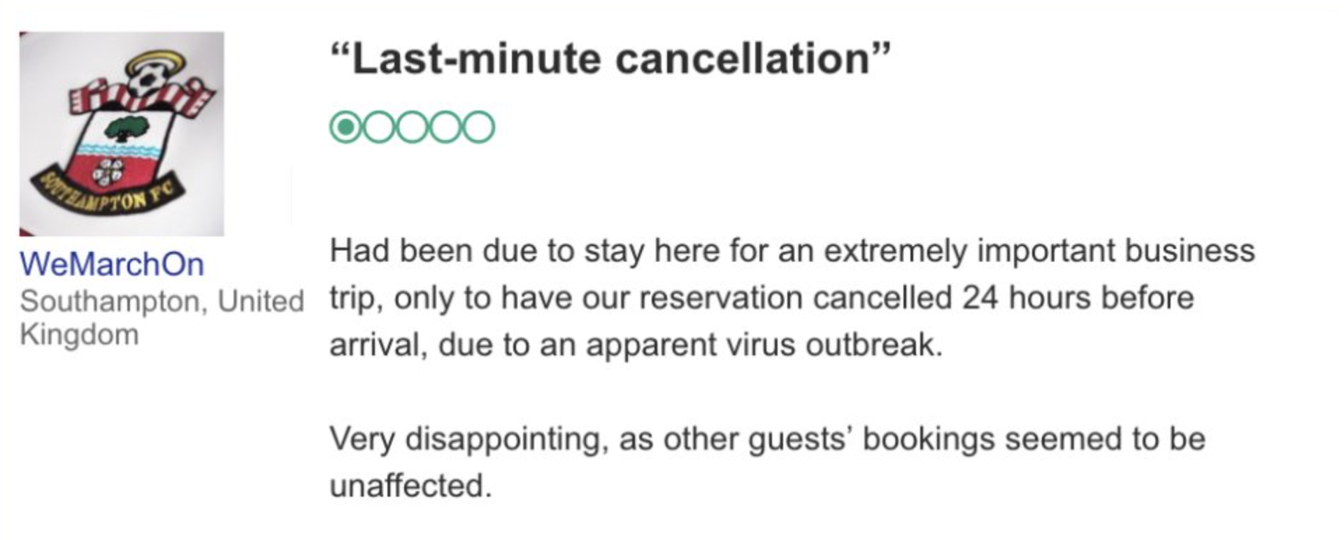 Capita a tutti di non trovarsi bene in hotel. Così è successo anche al Southampton prima della (decisiva) partita di martedì sera vinta contro lo Swansea grazie al gol di Manolo Gabbiadini. Una rete fondamentale, che ha regalato alla squadra inglese la permanenza in Premier League. Ma la sera prima era successo qualcosa di davvero particolare. Il Swansea Marriott hotel era stato costretto a cancellare la prenotazione dell’intera squadra a causa di un’epidemia di un virus. I Saints, nonostante la disavventura, sono riusciti evidentemente a trovare un’altra sistemazione last minute, non esattamente il massimo per una squadra in piena lotta salvezza. Il giorno dopo la partita, l’account Twitter del Southampton ha deciso di pubblicare la recensione fatta dell’hotel su Trip Advisor, con tanto di “una stella”, il minimo sindacale nel criterio di valutazione del noto sito web.