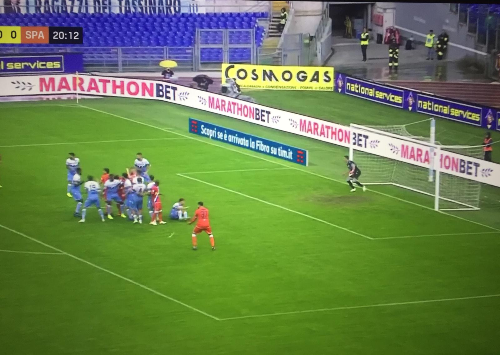 Minuto 20′ all’Olimpico punizione per la squadra ospite, sul punto di battuta va Costa che cerca il colpo rasoterra per far passare la palla sotto la barriera e spiazzare così Strakosha. L’attaccante della Lazio però intuisce il pericolo e si tuffa come Brozovic pochi istanti prima del tiro per cercare di intercettarlo.