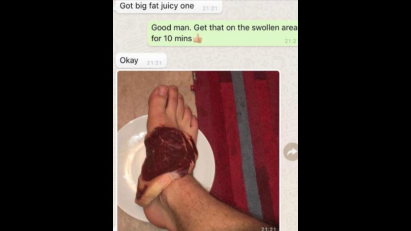 E voi ora vi starete chidendo qual è il rimedio per una caviglia gonfia? Semplice per il suo compagno, ops “fisioterapista” è una bistecca da appoggiare accuratamente sul piede. Peccato che Tom non l’avesse in casa e ascoltando quei preziosi consigli decide di mandare suo padre a comprarla dal macellaio, rimediando nell’attesa con una bella busta di piselli congelati, che però a detta del finto fisioterapista sono utili appena si verifica l’infortunio. Molto meglio una lombata a distanza di 24 h e Tom, da paziente diligente, non appena riceve dal padre la bistecca la posa sulla caviglia e invia la foto al “dottore” ringraziandolo per l’aiuto, convinto che grazie a lui potrà recuperare e giocare la partita del weekend.