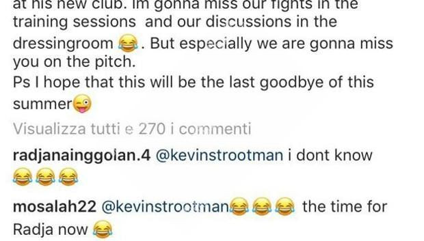 miss you on the pitch. Ps I hope that this will be the last goodbye of this summer”. Proprio quest’ultima frase (poi rimossa da Strootman) ha portato Radja Nainggolan e Mohamed Salah, trasferitosi al Liverpool, a scherzare e giocare con il pensiero dell’olandese: “I don’t know” dal belga seguito dall’egiziano: “The time for Radja now”. ‘Non lo so’ e ‘ora è il tempo di Radja’ per farsi due risate. Tra di loro, ma su Instagram.