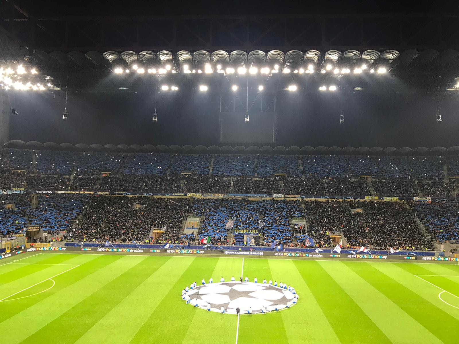 Inter-Barcellona, il teatro è un San Siro tutto esaurito e che ha fatto registrare un incasso record di oltre 5.8 milioni di euro (incasso più alto della storia per una squadra italiana in Champions League). Il Giuseppe Meazza si veste, per l’occasione, di nerazzurro per accogliere il Barcellona di Leo Messi, ma senza Leo Messi. Tutte le foto della coreografia.
