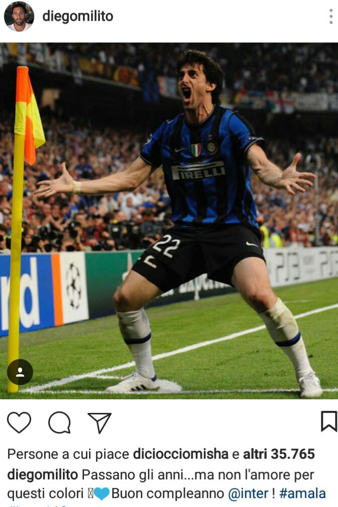 Milito: “Passano gli anni, ma non l’amore per questi colori…buon compleanno Inter”.