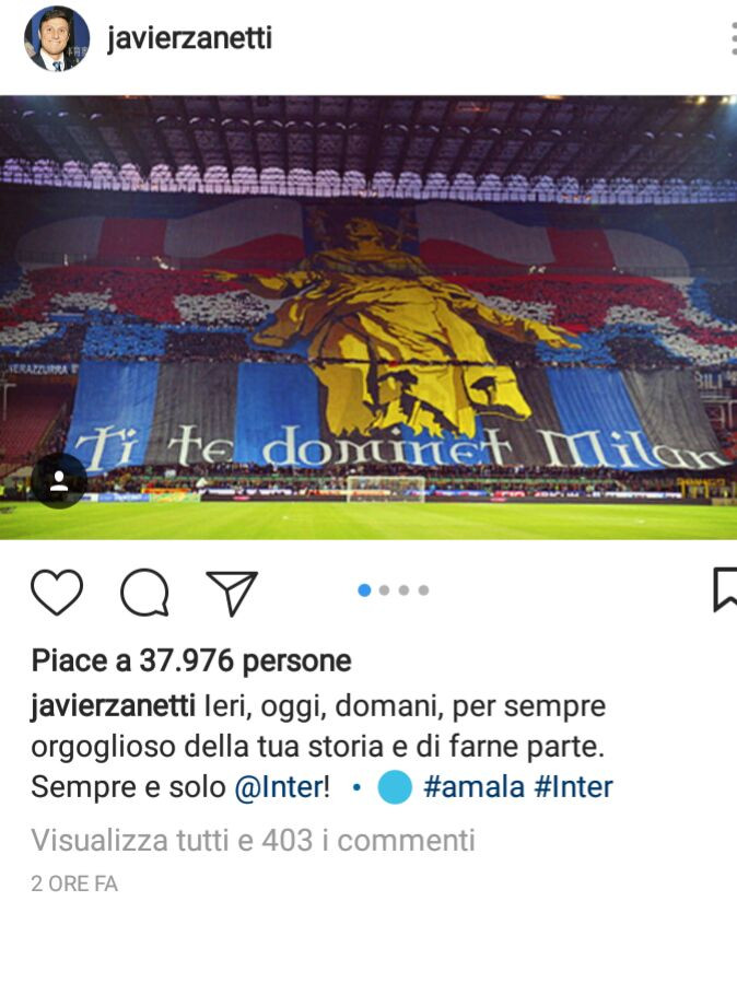 Zanetti: “Ieri, oggi e domani. Per sempre orgoglioso della tua storia e di averne fatto parte. Sempre e solo Inter”.