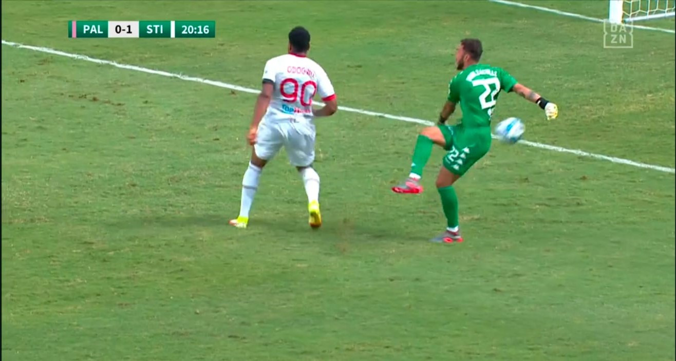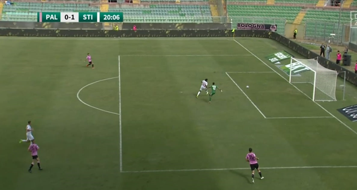 La dinamica è chiara: lancio lungo di Zaro, Mateju segue in solitaria il pallone e scarica all’indietro per Pigliacelli. Il portiere, sul pressing di Odogwu, temporeggia troppo e il lancio rimpalla sull’attaccante del Sudtirol, prima di entrare in porta.