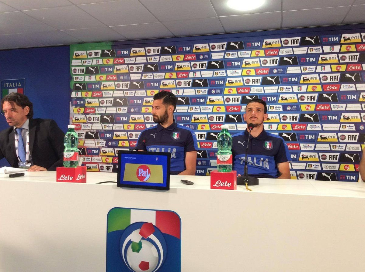 Candreva, Lazio, e Florenzi, Roma. In conferenza stampa spazio anche ad un riferimento ai rispettivi club e alla rivalità tra biancocelesti e giallorossi che con la Nazionale si annulla: “Noi in nazionale non parliamo di club, qui è un altro ambiente. Siamo concentrati sugli allenamenti e sul preparare le partite. Si parla solo dell’Italia e dell’avversario da affrontare”, ha risposto Candreva. “La maglia azzurra unisce tutti – ha aggiunto Florenzi -, unisce noi e dovrebbe unire tutti i tifosi”.