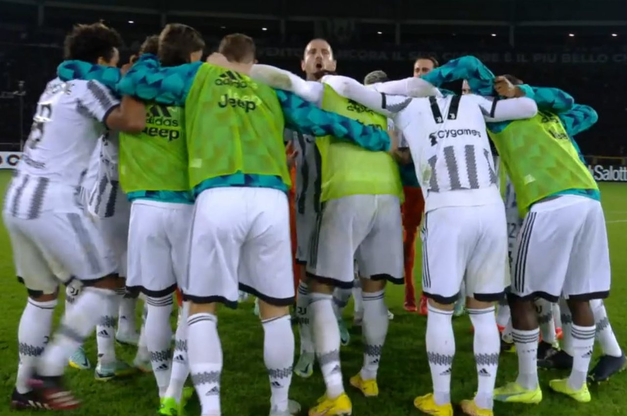 Vista l’importanza del match e il periodo complicato con anche il ritiro in Continassa dopo la sconfitta in Israele, la Juve ha ovviamente esultato a fine match. I calciatori si sono raggruppati a cerchio, abbracciandosi tra loro e probabilmente dicendosi qualcosa per alzare ancora di più fiducia e morale. Al centro del cerchio il capitano, Leonardo Bonucci.