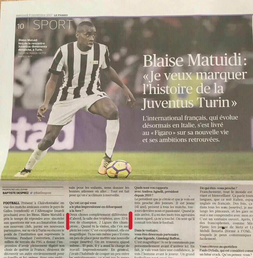 “Sono molto felice alla Juve. Non pensavo di sentirmi cosi bene subito dall’inizio. Questo club ha capito tutto. Se mi sento bene nella mia vita, lo sono anche sul campo, dunque la Juve ha fatto di tutto per la mia integrazione e quella della mia famiglia. Trovare una casa, imparare l’italiano, la scuola per i miei bimbi… Hanno fatto tutto.” Blaise Matuidi, in un’intervista al quotidiano francese Le Figaro, si dice entusiasta dei suoi primi mesi a Torino e colpito dalla storia bianconera: “Due cose completamente diverse: innanzitutto, la sala dei trofei, con 35 scudetti (la Lega ritiene che la Juve abbia vinto 33 campionati dopo la vicenda Calciopoli, ndr Le Figaro), due Champions League…”... eccezionale, stupenda. Non sai nemmeno se rimane un posto per un nuovo titolo, ma ne troveremo uno….Basta una sola settimana per capire perché la Juve vince cosi tanto. Lo staff è straordinario, c’è di tutto, ognuno ha il suo compito. La Juve non lascia niente al caso“. Una storia, quella fra la Juve e la Francia che ha tradizione negli anni: “Al mio arrivo, mi hanno parlato dei francesi che hanno fatto la storia della Juve : Deschamps, Henry, Trezeguet, Zidane, Platini… Un peso per me ? No. Prima di venire, ne avevo parlato con Evra e Pogba, che mi avevano detto solo cose belle. La Juve è un’istituzione, spero di fare la storia anch’io“. Matuidi non si nasconde e parla degli uomini che fino ad ora lo hanno colpito di più: “Agnelli è un presidente molto vicino. E’ giovane, presente a tutte le partite, è sempre con noi. Quando sono arrivato, ha avuto belle parole nei miei confronti, questo mi ha fatto piacere. Conosce alla perfezione il calcio“. Dalla società al campo: “Buffon un grandissimo, una leggenda. Prima di essere un grande calciatore è una grandissima persona. Con me, è stato stupendo, mi ha fatto sentire subito a mio agio. Quando ho firmato, è stato uno dei primi a scrivermi. Ha fatto la storia del calcio e spero che possa andare al Mondiale. Quando lo vedi tutti i giorni, capisci perché è riuscito a giocare così a lungo, non lascia niente a caso. E’ un leader. Mentre su Dybala: “Eccezionale. Ha 23 anni ed è già un gran talento, gli riesce tutto. Penso che andrà molto lontano”. Infine, sempre sulle pagine de Le Figaro, le sue parole si spostano su quello che è stato il suo inizio di stagione: “Positivo. In generale non è mai facile adattarsi ad un nuovo ambiente. Io ho risposto alle attese sotto questo punto di vista. Posso e devo fare meglio, tutto passa dal lavoro. Voglio ripagare la fiducia. Finire la carriere qua? Spero rimanere tanti anni. La vita è bella. Gli anni passano, i giovani stanno arrivando ma lavoro per rimandare la fine il più lontano possibile“. La chiusura è con il sorriso: “Nello spogliatoio della Juve parliamo tutte le lingue, italiano, francese, spagnolo… Ogni tanto faccio confusione e tutti ridono perché faticano a capirmi con il mio accento francese. E’ un spogliatoio molto aperto. Ci sono francofoni come Pjanic, Benatia, con cui comunico più facilmente”.
