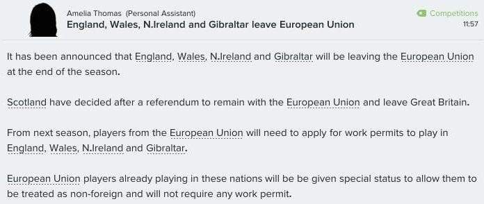 Avete mai provato a comprare un giocatore extracomunitario a Football Manager con un club inglese? Ecco, allora conoscete bene un concetto: permesso di lavoro, work permit. E sapete bene – ahinoi – quanto può ostacolare le vostre trattative, facendo magari sfumare sul più bello i vostri colpi migliori. E avete mai pensato cosa potrebbe succedere quando il Regno Unito formalizzerà l’uscita dall’Unione Europea? Brexit, il referendum c’è già stato. E ha vinto il “leave“. Presto l’UK invocherà l’articolo 50 e addio Unione. E nel calcio? Qualcosa cambierà, probabilmente. Dipende tutto da come usciranno dall’UE l’Inghilterra e gli altri Paesi del Regno Unito.