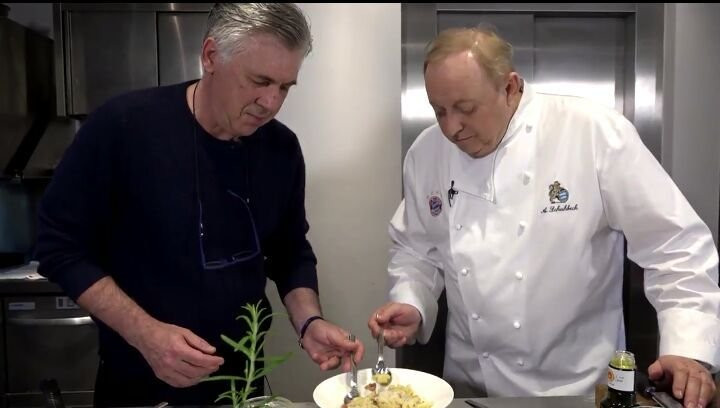 Lascia la panchina e va… dietro ai fornelli. Un po’ per passione, un po’ per divertimento, Carlo Ancelotti ha trascorso qualche ora nelle cucine del centro sportivo del Bayern Monaco per spiegare allo chef stellato del club, Alfons Schuhbeck, come preparare la pasta alla carbonara. Cavallo di battaglia della cucina italiana nel mondo, piatto tipico che in terra bavarese grazie ad Ancelotti diventa una ‘carbonara alla Carlo’. Pasta, pancetta, uova, parmigiano, cipolla (forse anche troppa) ed ecco che un po’ d’Italia entra nella cucina del Bayern Monaco. Un siparietto culinario divertente che ha visto Ancelotti protagonista. Non più allenatore, ma chef. Giusto il tempo di insegnare la sua ‘carbonara alla Carlo’.