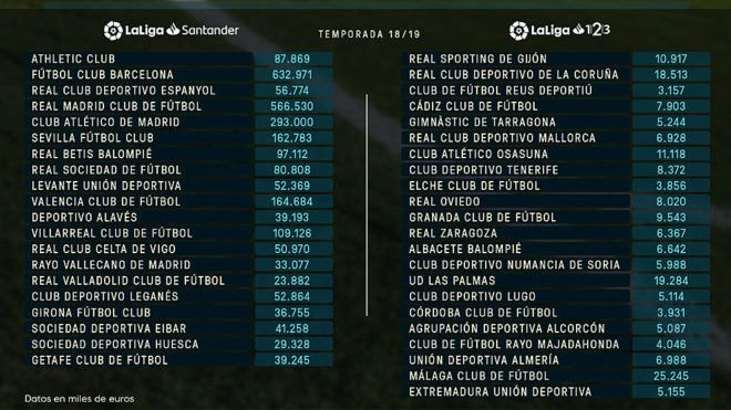 La Liga ha ufficializzato i limiti di spesa salariale di tutte le 20 squadre che ne fanno parte, per la stagione 2018/19. Si tratta dell’importo massimo che ogni squadra può spendere in questa stagione in costi per la prima squadra e corpo tecnico, affiliati, settore giovanile e altre sezioni. In che ambito? Stipendi, previdenza sociale, premi collettivi, costi di acquisizione e ammortamenti: quindi larga parte delle spese di un club, ma (bene sottolinearlo) non la totalità.
