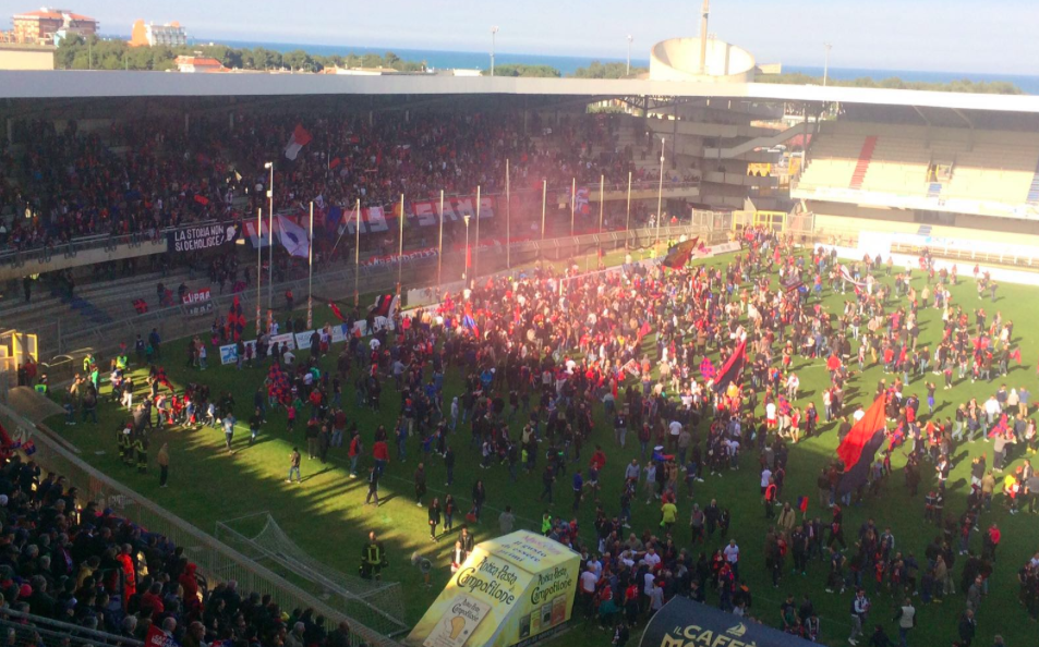 Festa doveva essere e festa è stata. La Sambenedettese torna in Lega Pro dopo 7 anni di attesa e lo fa davanti alla splendida cornice del Riviera delle Palme: 7000 tifosi impazziti di gioia per un trionfo bellissimo. I ragazzi di Palladini battono 2-1 la Jesina e chiudono i conti nel migliore dei modi, anche se con la sconfitta del Fano a Campobasso i rossoblù avrebbero ugualmente festeggiato la promozione. La Sambenedettese parte subito forte, con Titone che già al 3′ fa tremare la traversa sugli sviluppi di un corner. La rete del vantaggio è solo rimandata e arriva puntuale al 19′ con lo stesso Titone che salta il Tavoni e appoggia in rete il suo diciassettesimo gol stagionale.