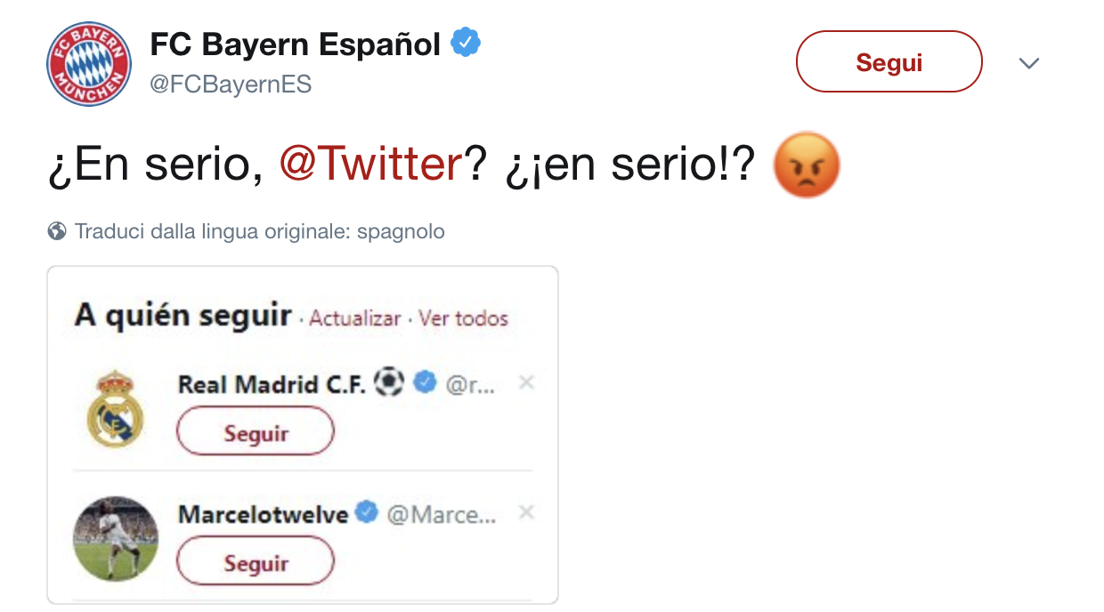 “Sul serio, Twitter?”. Una maledizione, social, che vede protagonista il Bayern Monaco. La squadra tedesca è stata sconfitta ieri sera nella partita d’andata della semifinale di Champions League dal Real Madrid di Zidane. Oggi un nuovo capitolo, in attesa della partita di settimana prossima. L’account spagnolo della squadra bavarese ha infatti postato una foto davvero particolare. Non è un giocatore o un contenuto “normale”, ma uno screen di un suggerimento di Twitter per seguire nuovi account. Ed ecco che spuntano Real Madrid e Marcelo, non proprio gente qualsiasi.