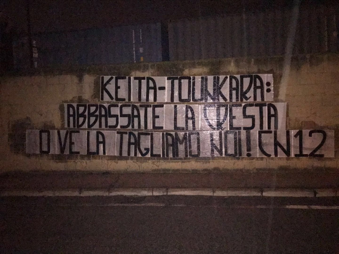 Ok, l’ex Barcellona ha un carattere difficile. Storia nota, legata soprattutto alla vicenda contrattuale (scadenza 2018). Comunicati, lamentale. Quest’anno, sia lui che la Lazio hanno vissuto situazioni particolari legate al suo comportamento. Tutto rientrato però, anche grazie alla mediazione di Simone Inzaghi. “Ma che c’entra Tounkara?” direte voi. “Comportamenti fuori dal campo?”. Sì, ma non solo. Nel mirino c’è anche l’attaccante. In occasione della gara contro il Chievo, infatti, c’è stato un diverbio tra lui e un tifoso, reo di aver sputato a Lucas Biglia: “Chiedo scusa a tutta Lazio, ho difeso il capitano”. Tra i due “è volata anche una manata”. E ora rischiano entrambi il Daspo. Brutta storia. Tounkara, oltretutto, è stato reinserito in rosa dopo sei mesi da separato in casa. Ha esordito anche a Pescara, negli ultimi 5’ al posto di Immobile: “Sono felice, ringrazio Inzaghi”. Ma ecco lo striscione. Un avvertimento, una minaccia. Tounkara e Keita nel mirino.