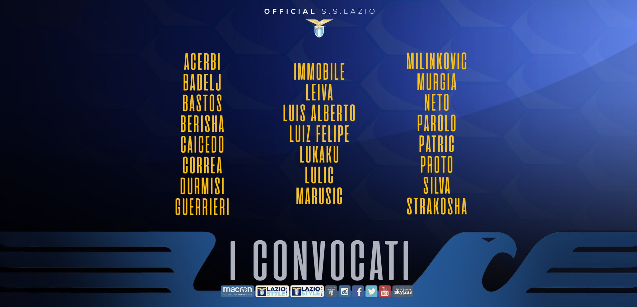 LAZIO (3-5-2): Stakosha; Bastos, Acerbi, Luiz Felipe; Marusic, Milinkovic-Savic, Badelj, Luis Alberto, Lukaku; Caicedo, Immobile.
