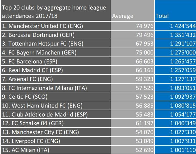 La classifica stilata dal UEFA per la stagione 2017/2018 vede al comando il Manchester United con 1.424.544 spettatori e una media di 74,976, seguito dal Borussia Dortmund a quota 1.351432 con una media a partita di 79,496 spettatori.