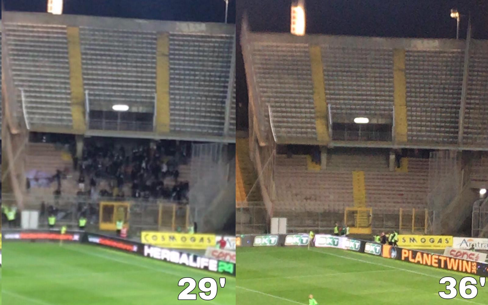 Cinque gol segnati in trenta minuti, Tabanelli, Petriccione, La Mantia, Mancosu e Falco che salgono sulla giostra del gol. Il Lecce di Liverani scende in campo come meglio non avrebbe potuto, contro un Ascoli fin qui mai in partita e apparentemente impotente di fronte agli attacchi di Mancosu e compagni. Al 30esimo minuto il Lecce trova la cinquina, con un calcio di rigore assegnato per fallo di Brosco su La Mantia e trasformato da Falco. Da lì, la protesta – silenziosa – dei tifosi dell’Ascoli. Pochi i fischi per la squadra di Vivarini, ma al 36esimo minuto il settore ospiti si svuota: troppi i gol subiti, inaspettato l’atteggiamento dell’Ascoli, che pur veniva da cinque risultati utili positivi.