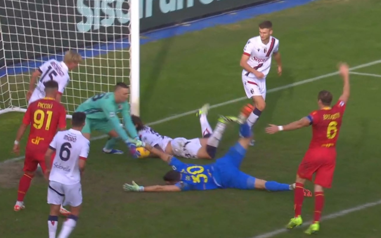 Succede di tutto nel finale di partita di Lecce-Bologna. Sul risultato di 0-1 per la squadra di Thiago Motta, infatti, Calafiori ha fatto fallo sul portiere avversario Falcone, per l’occasione all’interno dell’area di rigore rossoblù.