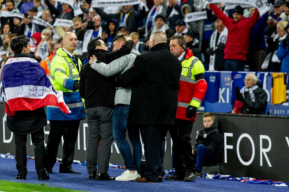 Leicester che prima della sfida contro il Burnley è entrato in campo per abbracciare il figlio del presidente