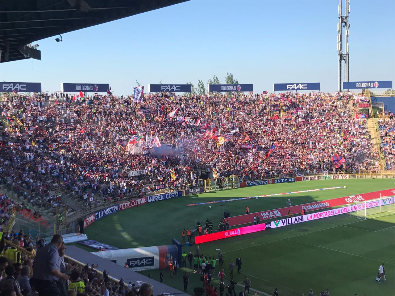 Ultima giornata di campionato: il Bologna può salutare il suo pubblico al Dall’Ara, contro la Juventus già forte dello scudetto conquistato. Nessun pensiero di classifica, ma tanto entusiasmo, perché nessuno vuol chiudere male. In alto le immagini dallo stadio, pochi istanti prima del calcio d’inizio.