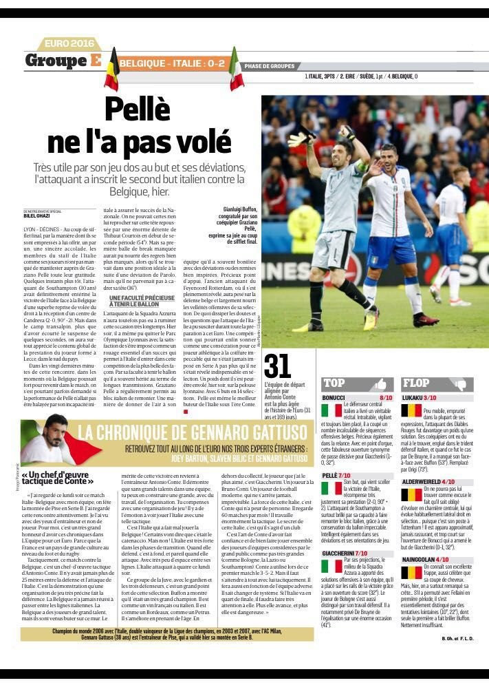 Ora è al Southampton e ieri, in extremis, ha siglato il gol del 2-0 dopo averne divorato uno a metà primo tempo, di testa, a due passi da Courtois. Pellè ne l’a pas volé. Ossia: Pelle non l’ha rubato. C’è anche lui in primo piano su L’Equipe ma è soprattutto l’Italia ad esserci, nel suo insieme, nel suo saper essere squadra, brava a colmare lacune tecniche con organizzazione e collettivo. “L’Italia dà una lezione”, si legge. Di calcio ma anche di unità d’intenti. La vittoria, secondo L’Equipe, è arrivata “con la logica” contro una squadra ricca di talento e poco altro. Alla vigilia di Francia–Albania, mentre Deschamps prova a stimolare Pogba dopo l’esordio opaco contro la Romania, l’Italia ruba la scena ed occupa diverse pagine del quotidiano locale.