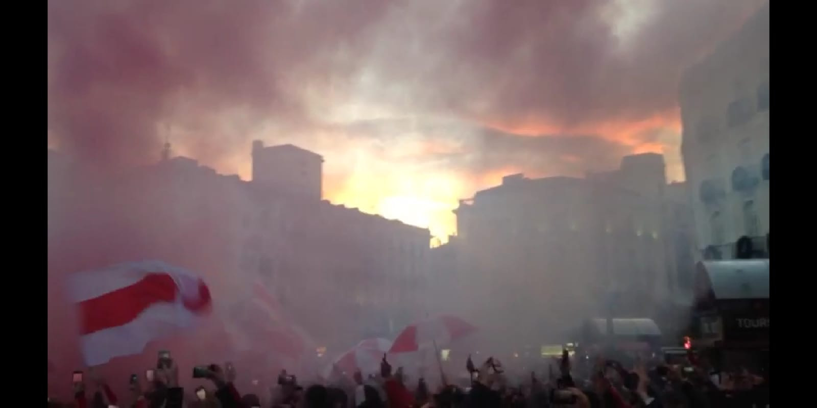 Madrid invasa dai tifosi argentini. Impossibile non incontrarli nelle vie, molto più facile vederli riuniti nelle piazze. Il River ha scelto Puerta del Sol, la piazza più famosa di Madrid, per dar luogo al suo banderazo. Una piazza immobile a osservare lo spettacolo di chi con la sua passione ha cambiato totalmente la giornata della capitale spagnola. Cori, fumogeni e ombrelli colorati: il Superclásico è arrivato a Madrid in anticipo se è impossibile non accorgersene.
