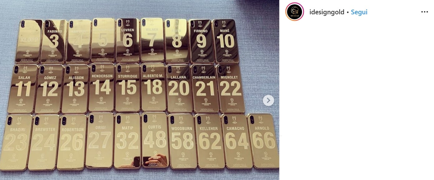 Un regalo da Champions. Lo si può definire così l'omaggio ricevuto dai giocatori del Liverpool dopo la vittoria in finale contro il Tottenham. Una cover per iPhone interamente ricoperta d'oro 24 carati, spedita da iDesign Gold: azienda leader nel suo settore. Nome, umero di maglia, il logo della Champions League e della finale di Madrid, ogni Reds ha così ricevuto il suo regalo personalizzato.