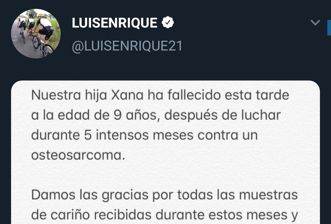 Una perdita immensa, una scomparsa prematura per un male contro il quale tutta una famiglia ha combattuto per mesi. La figlia di Luis Enrique, Xana, è scomparsa all'età di 9 anni, portata via da un osteosarcoma.