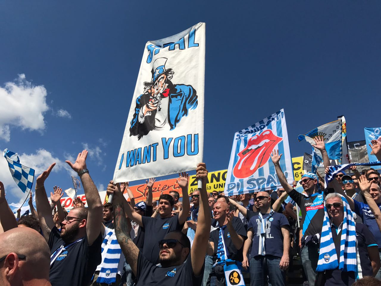 “Non importa…”: parola d’ordine. Perché “si festeggia alla prossima in casa!”. Tutto spiegato. Festa solo rimandata, quelli della SPAL ne sono più che sicuri. Ed infatti nella ‘Curva Piscina’ dal Picco di La Spezia la festa continua. Il pareggio di oggi è solo un altro mattoncino verso la Serie A. “E tanto già lo so che l’anno prossimo… gioco all’Olimpico”. E…”Serie A, SerieA, SerieA!“, i cori più gettonati. Delusione per una promozione non ancora matematica? “Macchè! Un pareggio oggi va più che bene”. Orgoglio vero, questa SPAL. “Chi se l’aspettavo di essere qui qualche mese fa”. Entusiasmo, quasi eccitazione. Un obiettivo che sta per diventare realtà. Si percepisce dall’affetto con cui la Curva Piscina accoglie i propri giocatori a fine partita. Applausi scroscianti. L’abbraccio di un popolo che sognA. E che anche all’uscita dallo stadio non intende fermarsi. I materassini, le cuffie e gli occhialini da piscina abbandonano il Picco insieme agli spallini in attesa di essere riposti nel cassetto e sfoggiati alla prossima in casa. Sperando che sabato si possa finalmente realizzare questa favolA. “E tanto già lo so che l’anno prossimo… gioco all’Olimpico”. Si continua a cantare fino ai pullman diretti a Ferrara. Perché in fondo non importa: “la festa è solo rimandata, alla prossima in casa”. Qui ne sono più che convinti anche se la promozione non è ancora diventata matematica.
