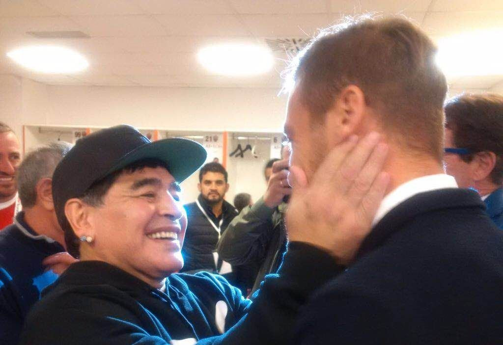 Totti e Maradona all’Olimpico per la Partita della Pace. Uno scambio di battute tra due grandi numeri 10. Il campione argentino però lancia un assist al capitano giallorosso: “Dirò a Totti di giocare ancora”. E lo stesso Totti quando gli riportano la battuta di Maradona commenta scherzando: “Ma chi è il presidente della Roma?”.