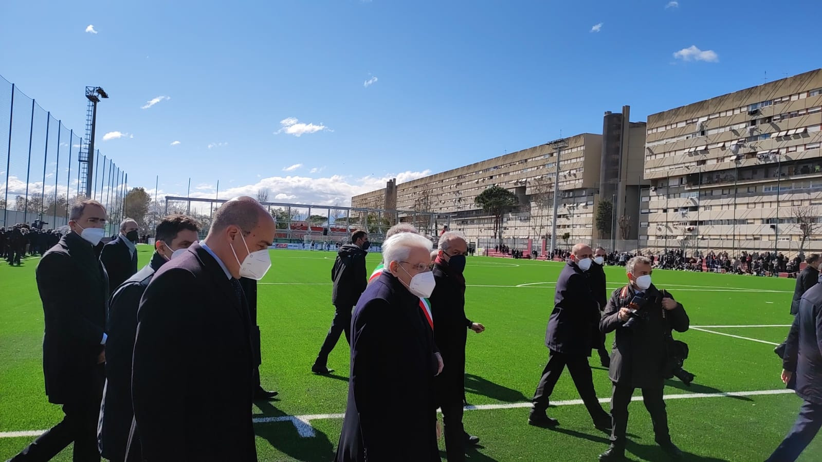 Sotto i mille occhi del serpentone che sovrasta il campo, poco dopo, i ragazzi del Calciosociale hanno giocato la partita inaugurale, con il presidente Mattarella tifoso d’eccezione: “Questo campo dei miracoli è un luogo che esprime speranza fiducia e concreta crescita sociale. Si crea una realtà concreta, è un propellente alla crescita individuale e sociale. Se i bambini apprendono questo criterio, di collaborare questo consente loro in futuro di essere protagonisti in senso positivo. Rispettatevi sempre tra di voi. Rispetto per tutti e collaborazione. Oggi si inaugura non un campo di calcio ma una prospettiva”, ha detto ancora il Capo dello Stato.