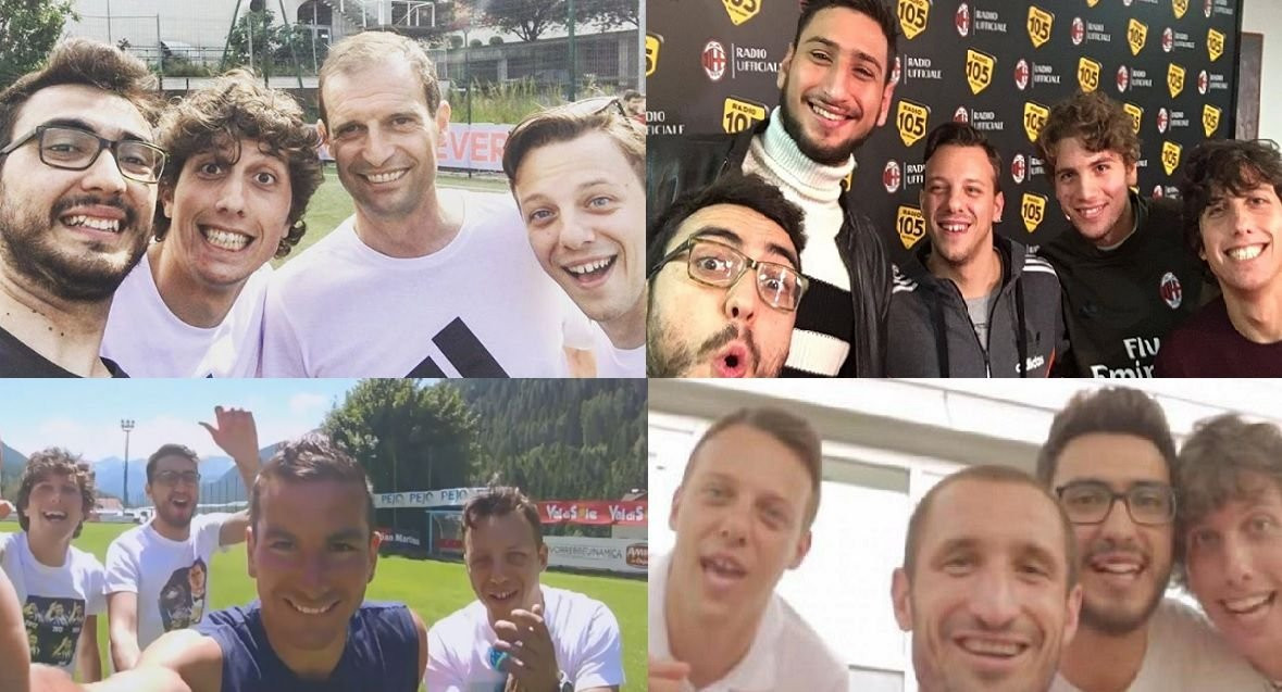 Prima partita vista allo stadio? “Ero veramente piccolo. Era un Trofeo Berlusconi con Birindelli che marcava Weah, pensa! Questa scena mi è rimasta impressa. Partita indimenticabile? Germania-Italia 0-2 del 2006, lì capimmo tutti che avremmo vinto il mondiale e batterli in casa è stato bellissimo. L’altra è fresca, Italia-Spagna 2 a 0. C’è un motivo! Gli scorsi Europei li abbiamo vissuti molto da vicino, abbiamo fatto diversi parodie sulle partite e i personaggi, Conte e Buffon in testa: per questo per noi quella gara rimarrà indimenticabile”. I calciatori e gli allenatori più simpatici? “Premetto che sono stati un po’ tutti al gioco. Tra quelli particolarmente simpatici metto di sicuro Max Allegri e Sinisa Mihajlovic. Tra i più disponibili Simone Padoin, il talismano, e Giorgio Chiellini. E aggiungerei anche Javier Zanetti. Visti da vicino cominci a conoscerli veramente e scopri persone ironiche e solari, tranquille. Penso che a volte sia quasi una necessità, prendere alcune situazioni con più leggerezza, nel calcio ce n’è molto bisogno. Calciatori e allenatori sono sempre circondati da giornalisti, a volte si creano tensioni e polemiche, aria pesante. Quindi se vedono qualcuno che affronta l’argomento con il sorriso si rendono molto più disponibili”.