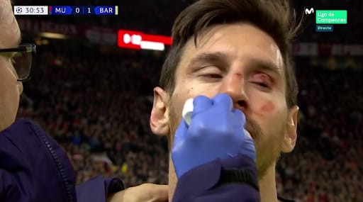 Un fallo che ha lasciato Messi sanguinante a terra e prontamente soccorso in campo dallo staff medico blaugrana. L'intervento di Smalling non è stato sanzionato dall'arbitro Rocchi (direttore di gara a Old Trafford) ma i tifosi del Barça sui social si sono scatenati contro lo stesso Smalling, ancor di più a leggere gli aggiornamenti da parte della stampa spagnola che scrivono di una possibile rottura del setto nasale, in attesa di riscontri ufficiali.