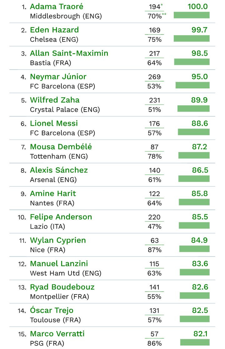 Superare un avversario in velocità, magari con un dribbling. Non c’è niente di meglio per i calciatori rapidi ed estrosi che spesso si divertono a scappare via ai difensori in questo modo. Cies Footbaal obsveratory, ha stilato una statistica sui migliori dribblatori d’Europa, rapportando il numero di dribbling provati con quelli riusciti. Al primo posto c’è lo spagnolo del Middlesbrough Adama Traoré, inseguito da Eden Hazard e Allan Saint Maximin del Bastia. In termini quantitativi invece,quelli che hanno tentato più dribbling sono Neymar (269), davanti a Wilfried Zaha (Crystal Palace) e Felipe Anderson (Lazio).Il primo italiano in classifica è Verratti al 15esimo posto. Poi Bonaventura (28°), Croce (45°), Petagna (55°), Spinazzola (66°) e Verdi (100°) a chiudere la graduatoria. Di seguito la top 10: